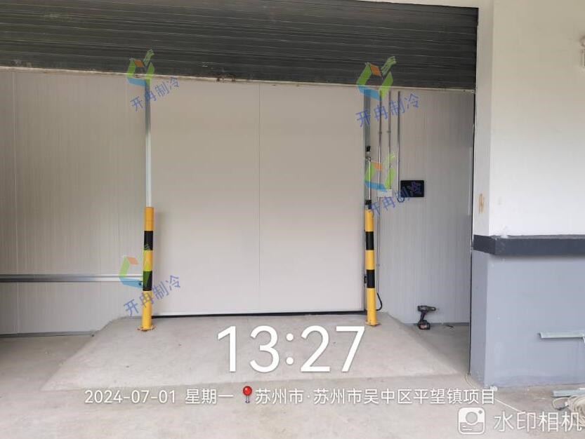 1、庫房部分:該農產品冷庫的墻體采用雙面0.426彩鋼100mm厚聚氨酯高壓發泡保溫板,密度40±2kg/m3,阻燃等級B1級。配備有單開手拉平移門,該門為雙面彩鋼聚氨酯保溫門,冷庫門帶防結露電加熱高抗凍熟料密封條,帶安全脫鎖裝置。與門聯動配備有風幕機以及設有PVC門簾,防止熱能進入。地面鋪設50mm厚XPS擠塑板兩層交錯壓縫鋪設,共100mm厚,阻燃等級B2級。擠塑板上下兩層鋪設PE隔汽膜,最后鋪設100mm厚鋼筋混凝土地坪(含門口斜坡)。此外,采用頂部T型鋁吊梁用于冷庫頂板加固,還配備有絲桿、密封硅膠等安裝輔料。