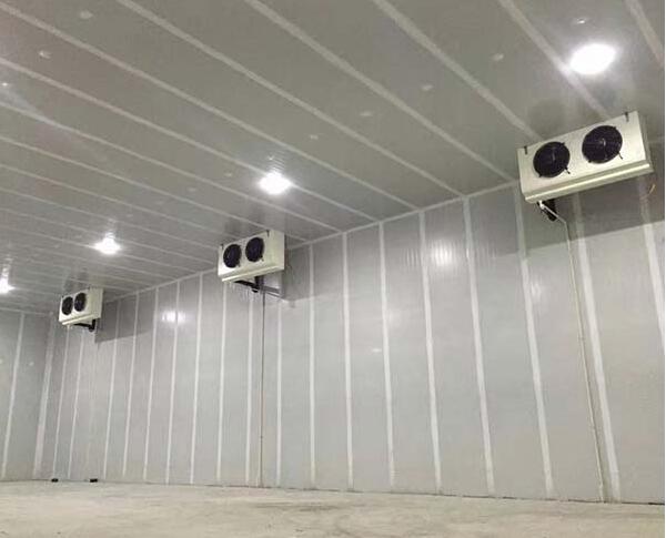 (2)11間氣調(diào)庫(kù)制冷系統(tǒng)配備的是1套125HP美國(guó)艾默生并聯(lián)渦旋壓縮機(jī)組;分揀車間庫(kù)制冷系統(tǒng)配備的是1套12HP美國(guó)艾默生箱式頂出風(fēng)制冷壓縮機(jī)組,該機(jī)組制冷量大,性價(jià)比高,安全可靠。冷庫(kù)內(nèi)均配備的是浙江凱迪系列高效強(qiáng)風(fēng)型冷風(fēng)機(jī),該風(fēng)機(jī)運(yùn)行穩(wěn)定噪音小,送風(fēng)距離遠(yuǎn),使得庫(kù)內(nèi)降溫速度快,極大增強(qiáng)了化霜效果,增加快速對(duì)流循環(huán),從而達(dá)到每個(gè)角落的溫度均勻性。